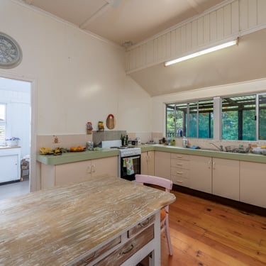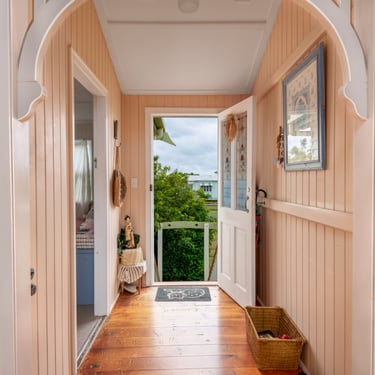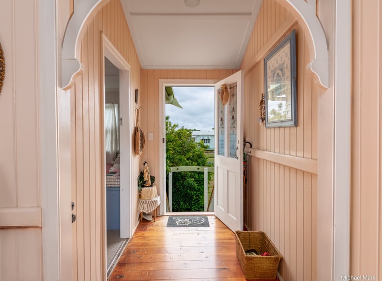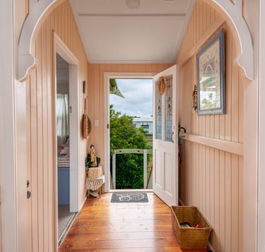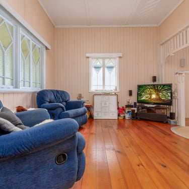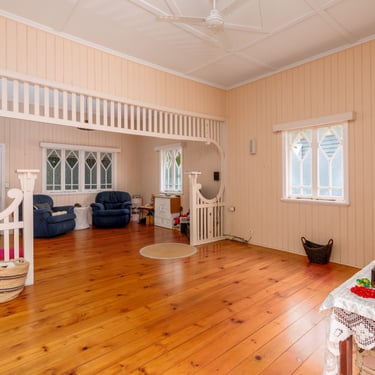 Living Areas: Open-plan lounge and dining area featuring polished timber floors and classic fretwork detail, adding a touch of timeless elegance.